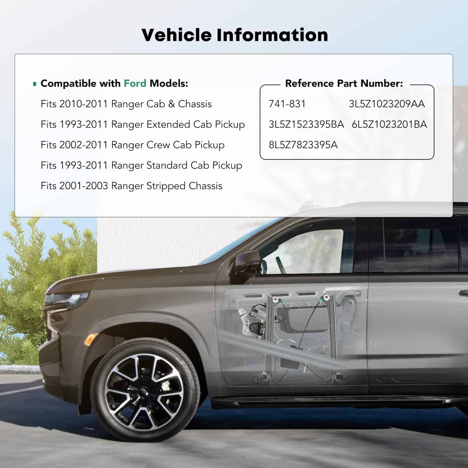 2. Ajuste perfecto: Nuestro Regulador de Ventana y Ensamblaje de Motor está diseñado para ser compatible con Ford Ranger 2010-2011 Cab & Chassis, Ranger 2002-2011 Recogida de Cabina, Ranger 1993-2011 Recogida de Cabina Extendida/Estándar, Ranger 2001-2003 Chasis Desnudo.