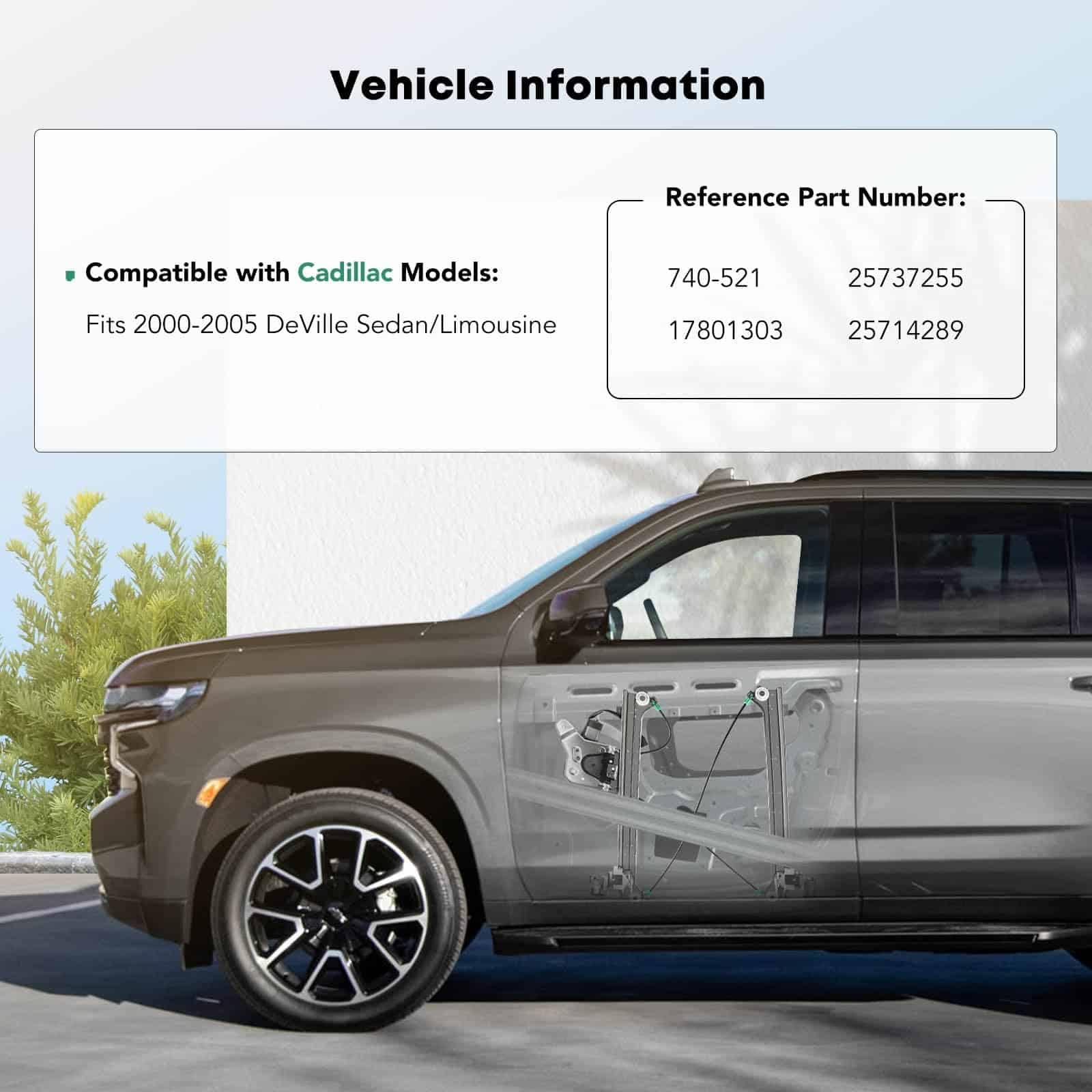 Estimado cliente, le presentamos el regulador de ventana eléctrico del lado del pasajero delantero para Cadillac DeVille 2000-2005 Sedán, Limusina y Cab & Chasis. Este regulador de ventana avanzado está diseñado para brindarle fiabilidad a largo plazo sin la necesidad de un motor de ventana adicional. Con una posición de montaje en el lado derecho delantero, del pasajero, y fabricado con materiales de metal y plástico duraderos, puede estar seguro de que este producto cumplirá con sus expectativas. Este regulador de ventana está diseñado para ser compatible con modelos específicos de Cadillac DeVille, como Base, DTS y DHS, asegurando un ajuste perfecto. Nuestra fabricación garantiza una operación estable y duradera, habiendo sido probada hasta 30,000 veces en funcionamiento. Con niveles de ruido por debajo de los 50 decibelios, este regulador de ventanas proporciona una experiencia silenciosa y confortable en su vehículo. La instalación es sencilla gracias a los puntos de montaje precisos, lo que facilita el proceso de plug-and-play. Además, ofrecemos un servicio de un año para cualquier defecto o problema que pueda surgir durante el uso normal. Disfrute de la tranquilidad y comodidad que brinda nuestro regulador de ventana eléctrico de alta calidad para su Cadillac DeVille. ¡Gracias por su compra!