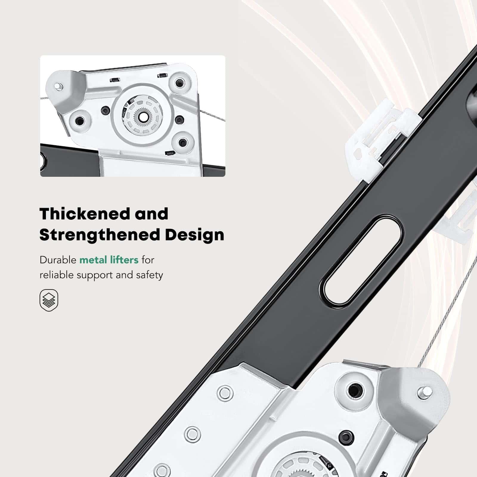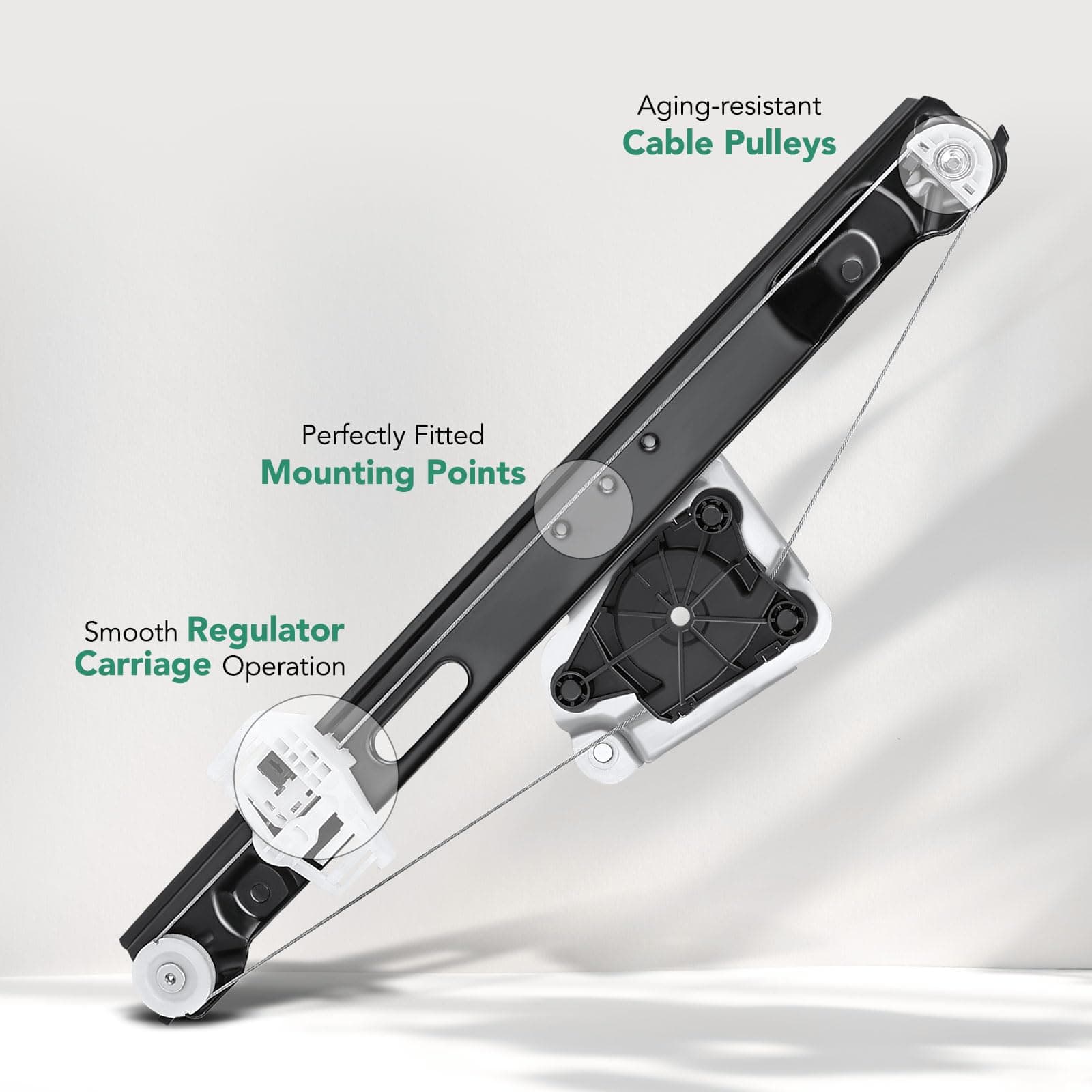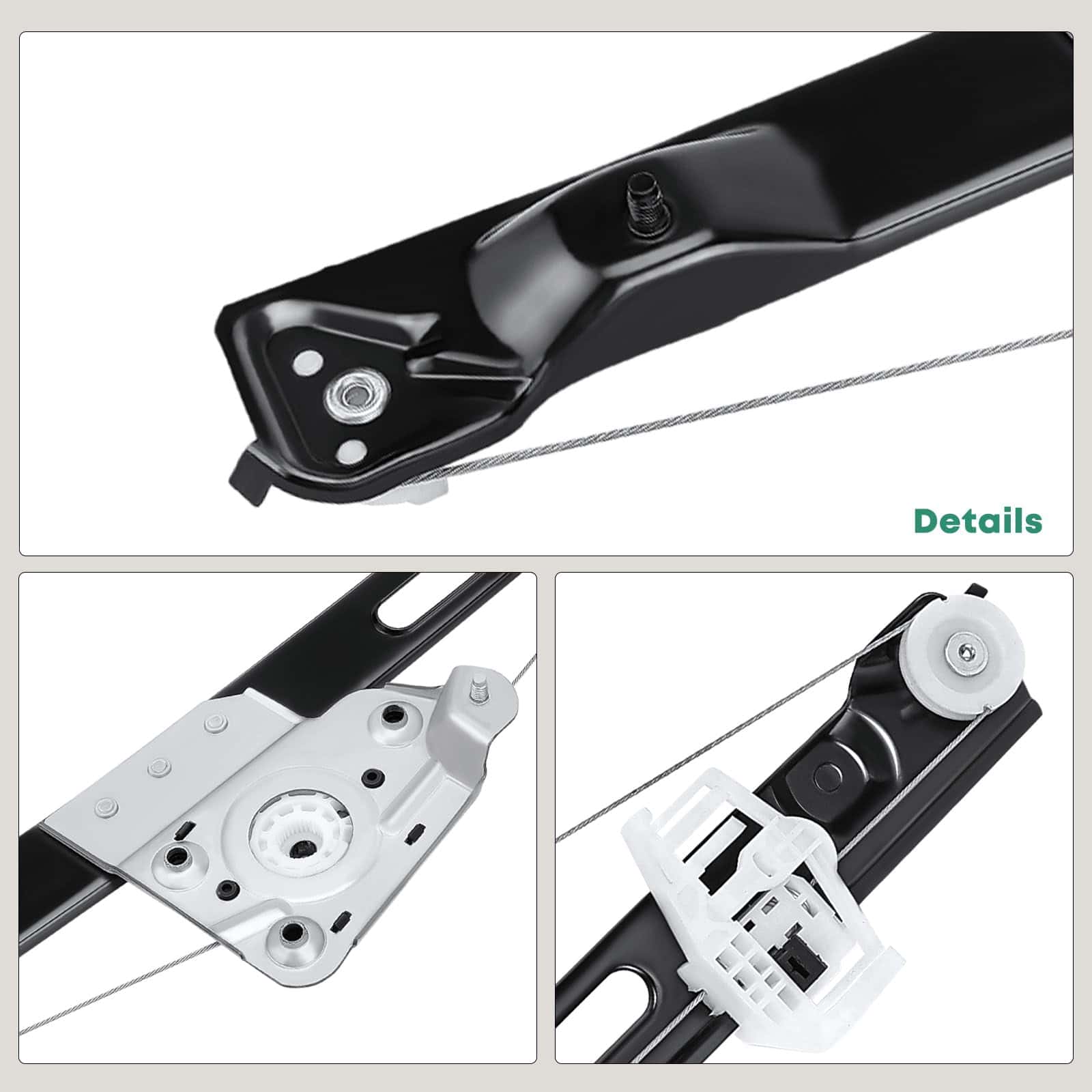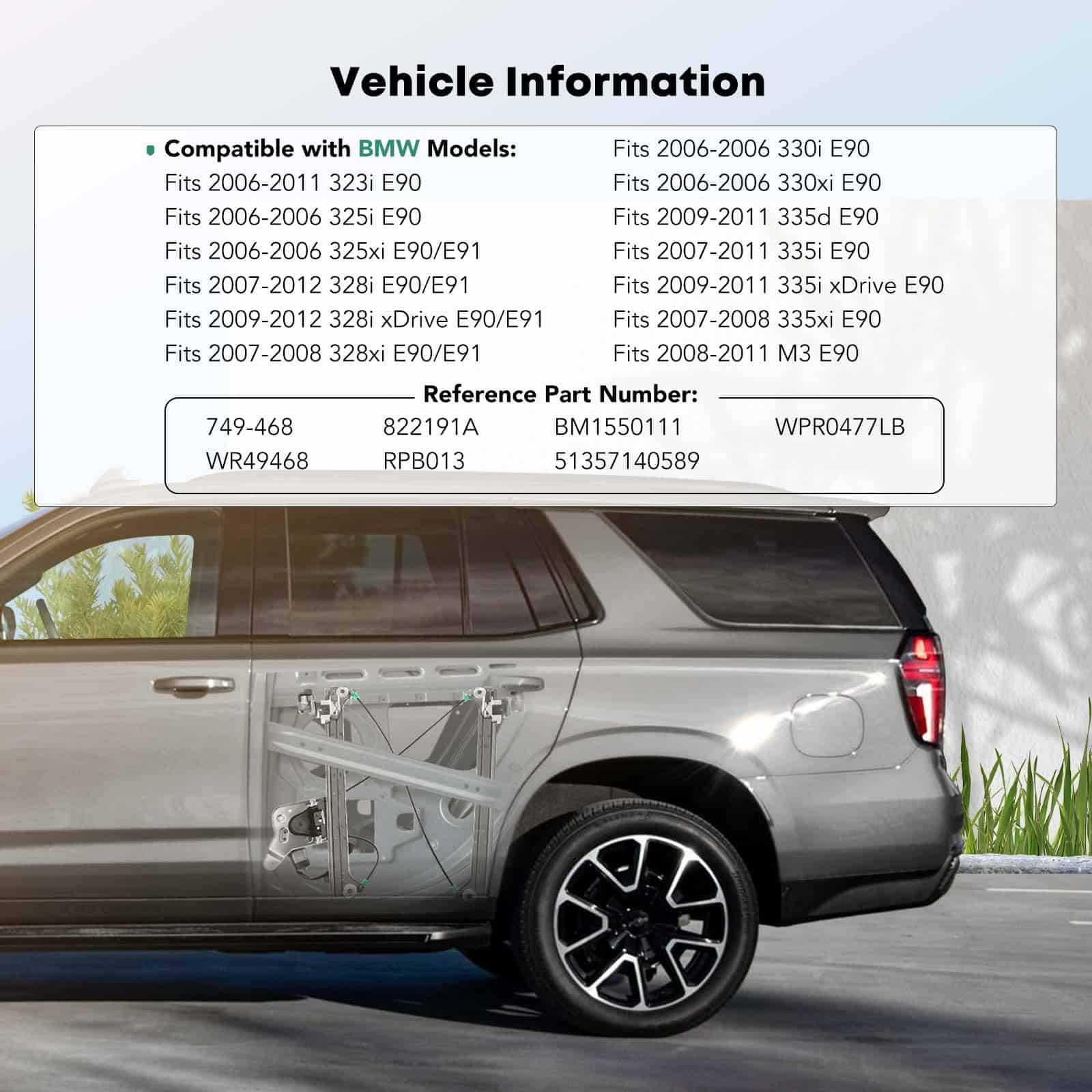Nuestro regulador de ventana y conjunto de motor está diseñado para ser compatible con la Serie BMW E90 323i 2006-2011, 325i/330i/330xi 2006, 335i 2007-2011 Sedán, 335d/335i xDrive 2009-2011, 335xi 2007-2008, M3 2008-2011 Sedán; Serie E90/E91 325xi 2006, 328i 2007-2012, 328i xDrive 2009-2012, 328xi 2007-2008 Sedán/Wagon. A través de hasta 30,000 pruebas, garantizamos que el relé, cable, clips y polea del regulador de ventana son duraderos según los estándares. Los kits de hardware del regulador de ventana están construidos para soportar -10 F a 150 F. Incluso en condiciones climáticas adversas, la ventana se desliza suavemente en las guías de rodillos. El funcionamiento del regulador de ventana del automóvil es extremadamente silencioso, con niveles de ruido por debajo de 50 decibelios y prácticamente ningún ruido, asegurando un entorno de conducción tranquilo y sin molestias que le permite concentrarse en el camino por delante. Con puntos de montaje precisos, las piezas del regulador de ventana son fáciles de instalar, lo que hace que sea un proceso simple de enchufar y listo. Brindamos un servicio de un año, asegurando que cualquier defecto o problema que surja del uso normal se resuelva.