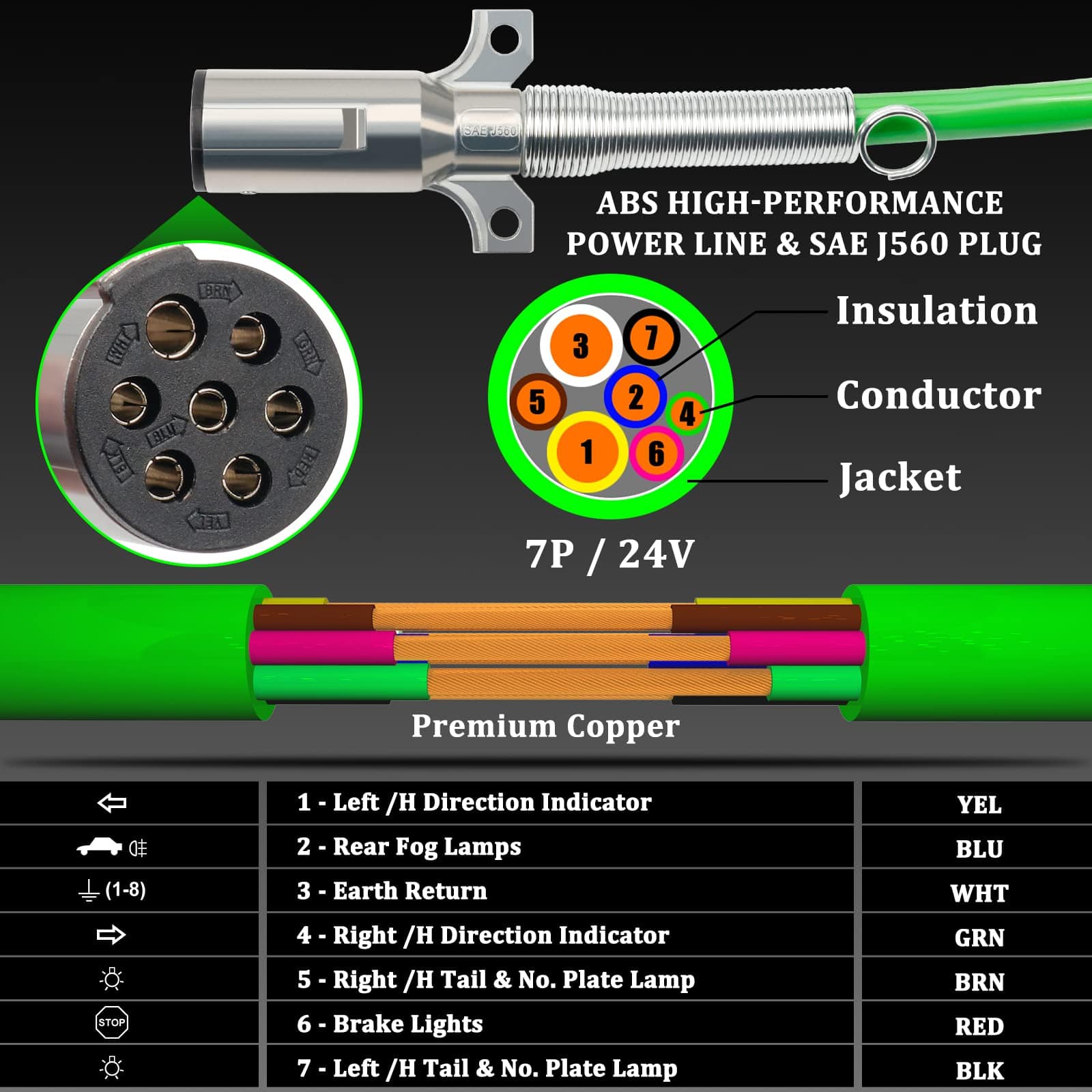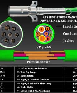 3. CABLE ELÉCTRICO DE 7 VIAS Nuestro cable de energía utiliza el enchufe de zinc fundido a presión estándar de la industria para transmitir eficientemente la energía desde el motor hasta su remolque/camión. El cable eléctrico de alta calidad asegura el uso normal de las luces como las señales de giro y las luces de freno durante la conducción.