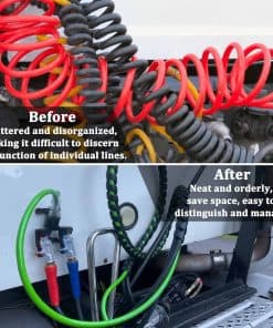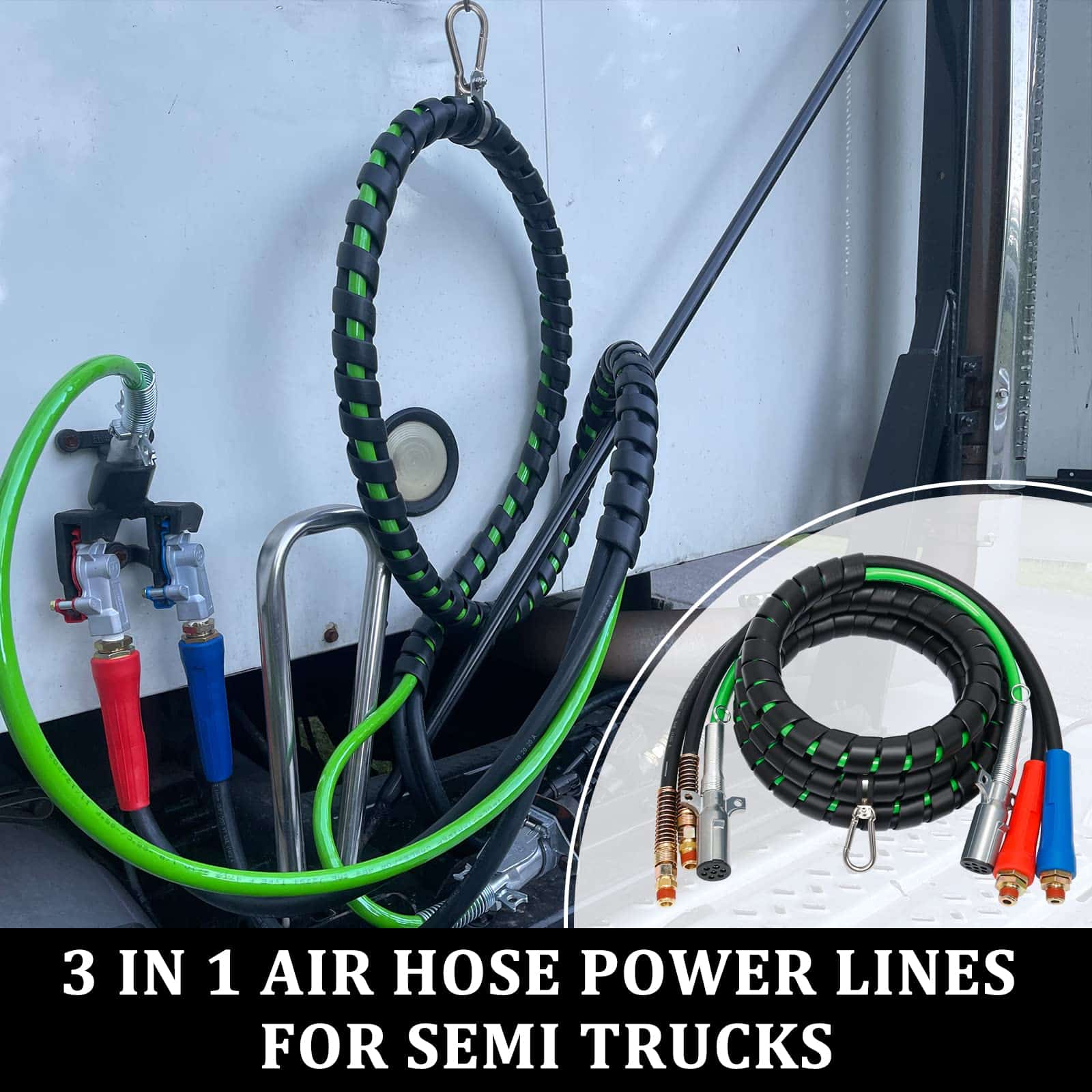 5. MANGUERA DE COMBINACIÓN DE 3 A 1 DE AIRE El kit de manguera de aire de camión semi puede mantener la parte trasera del tractor/remolque ordenada y organizada, ahorrando espacio y facilitando discernir la función y gestión de los cables individuales. La goma negra utilizada para envolver el exterior puede desempeñar un buen papel en la protección de la manguera eléctrica y las líneas de aire. Las mangueras de aire 3 en 1 fiables y de alta calidad para camiones semi le permiten transportar de manera más segura, más conveniente y ganar más.