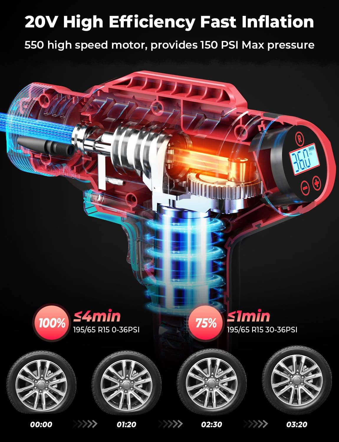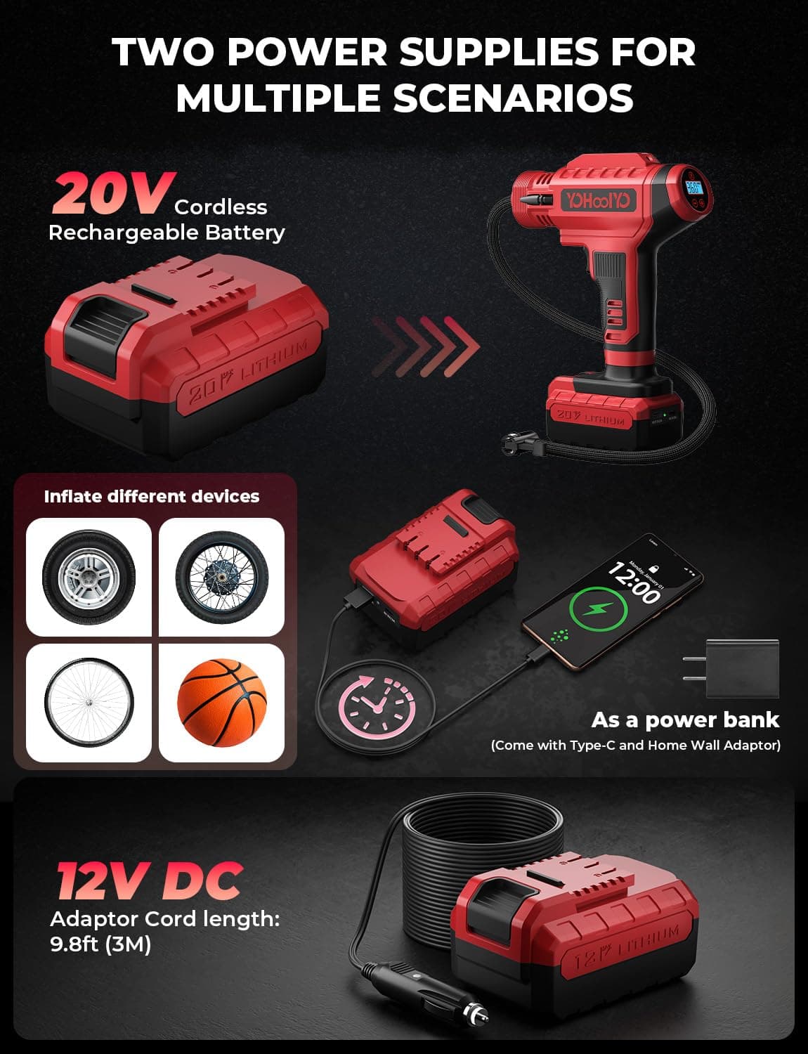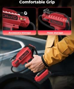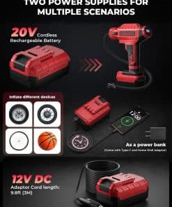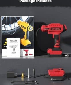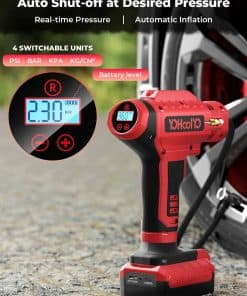 El inflador de neumáticos YOHOOLYO es la solución perfecta para inflar tus neumáticos de forma rápida y sencilla. Con una potencia de 20V y una bomba de neumáticos inalámbrica, este compresor de aire es versátil y fácil de usar. Viene con una batería recargable y un adaptador de 12V para el coche, lo que lo hace ideal para llevarlo contigo en tus viajes. Su medidor de presión digital garantiza una inflación precisa, mientras que la función de parada automática evita el exceso de inflado. Apto para motocicletas, bicicletas y coches, alcanza una presión máxima de 150PSI. ¡No te quedes sin inflar tus neumáticos con este inflador de alta calidad en color rojo!