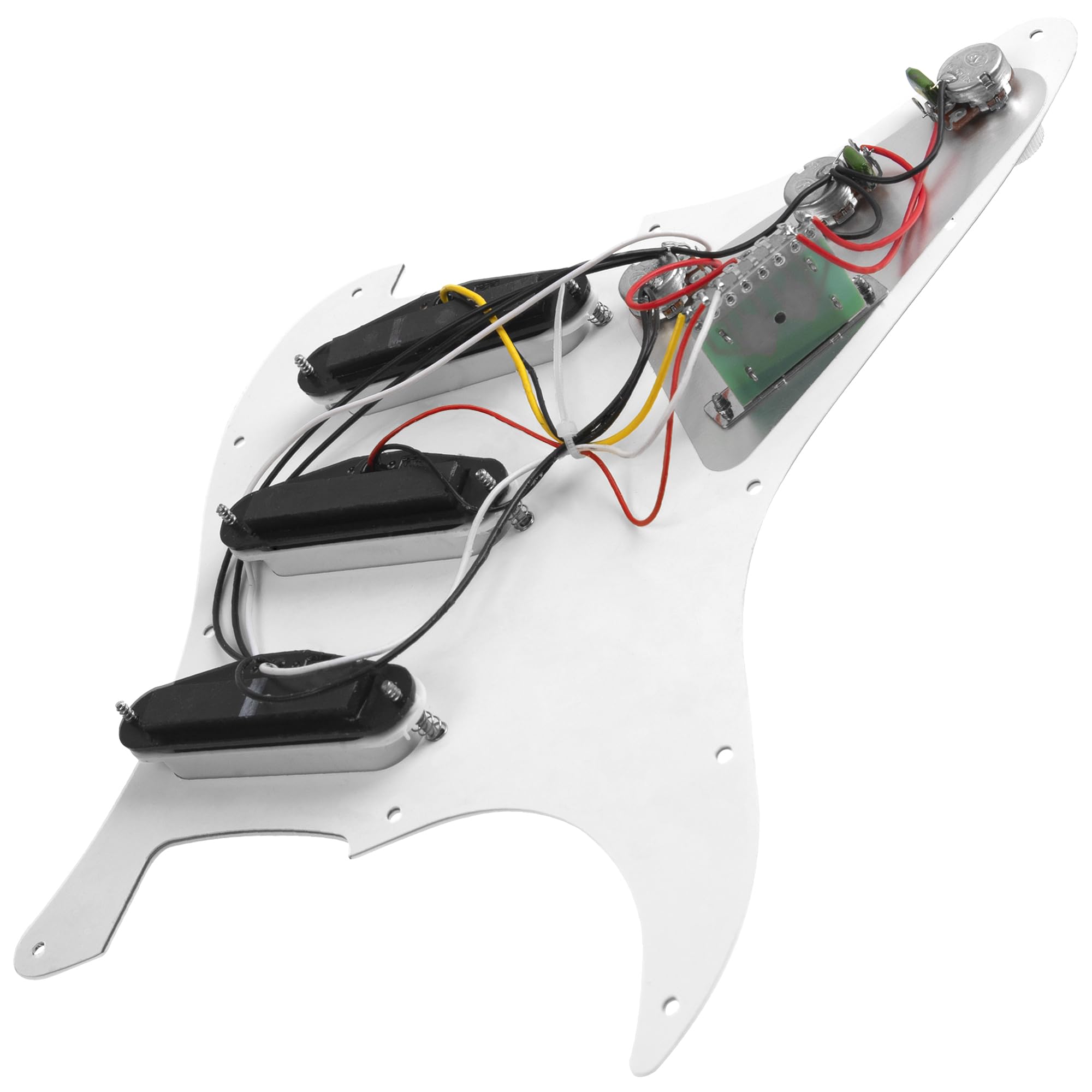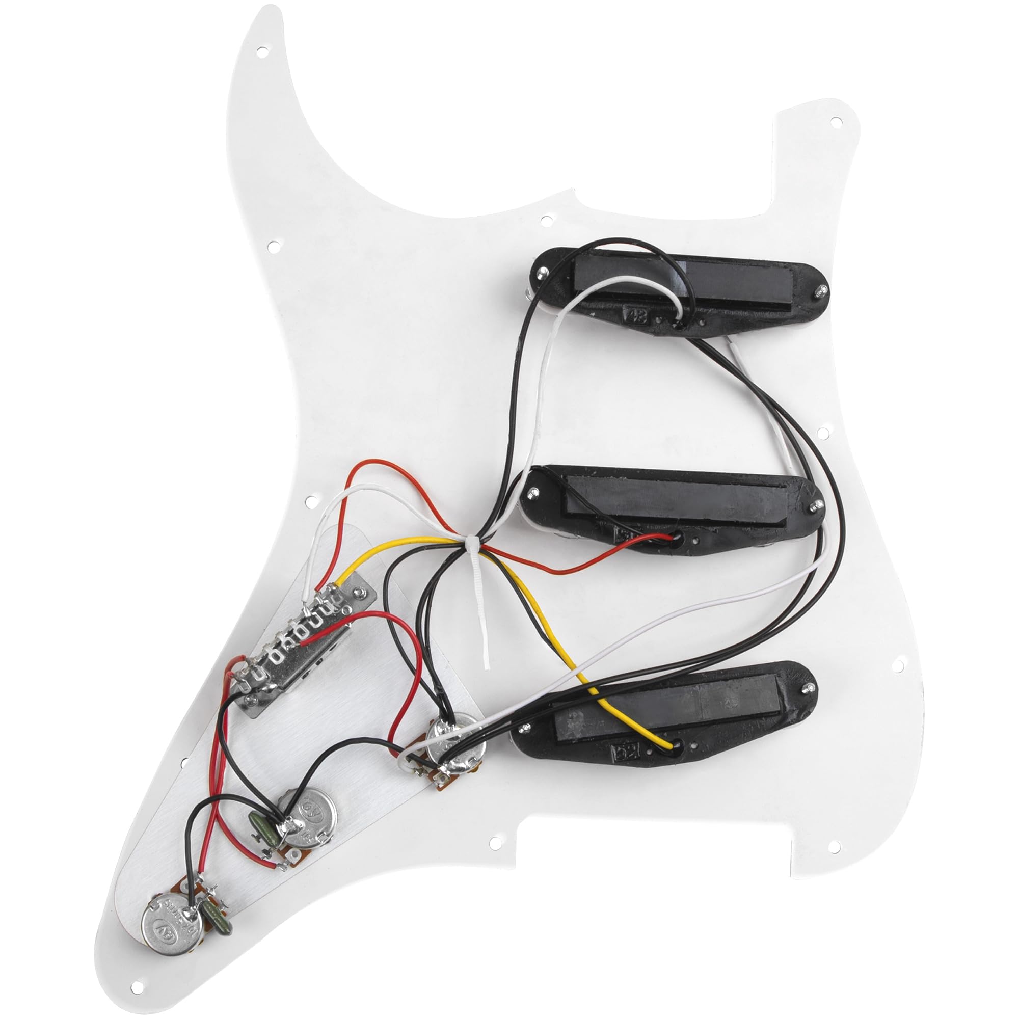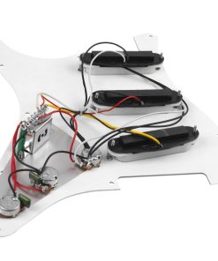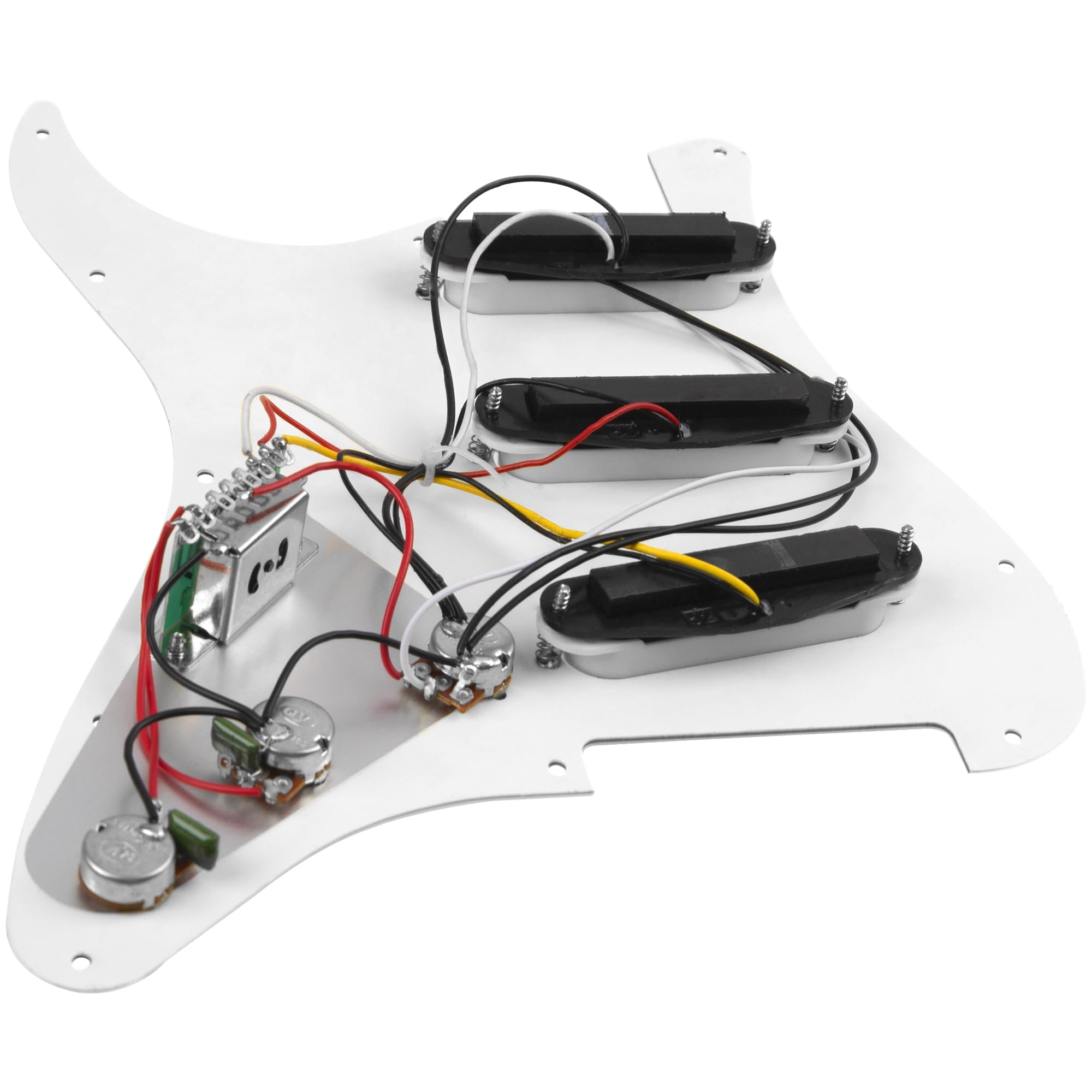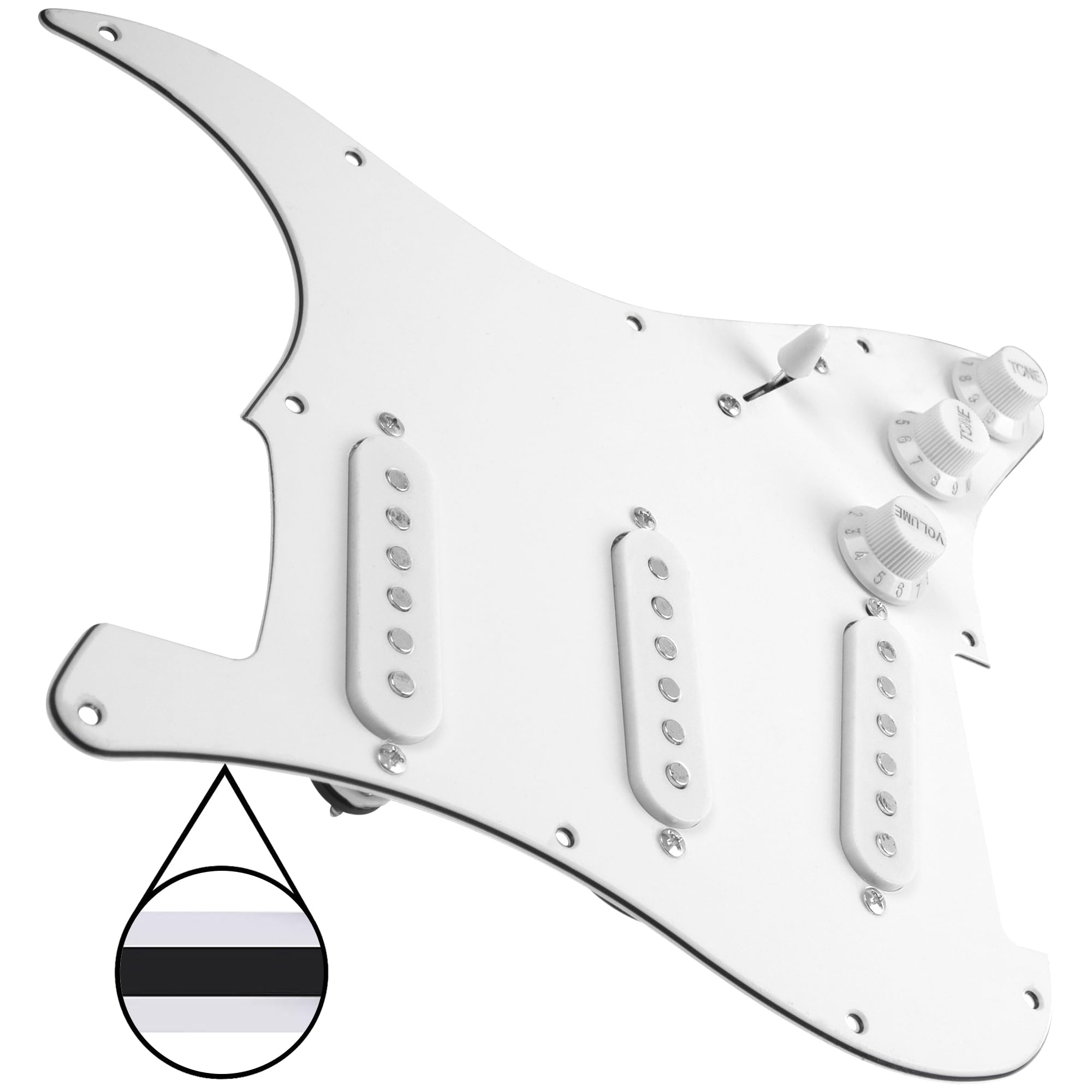 La pickguard sss de 3 capas viene con pastillas de bobina simple (3), el interruptor es un interruptor selector de pastillas de 5 posiciones y el cableado es un control de volumen y 2 controles de tono.