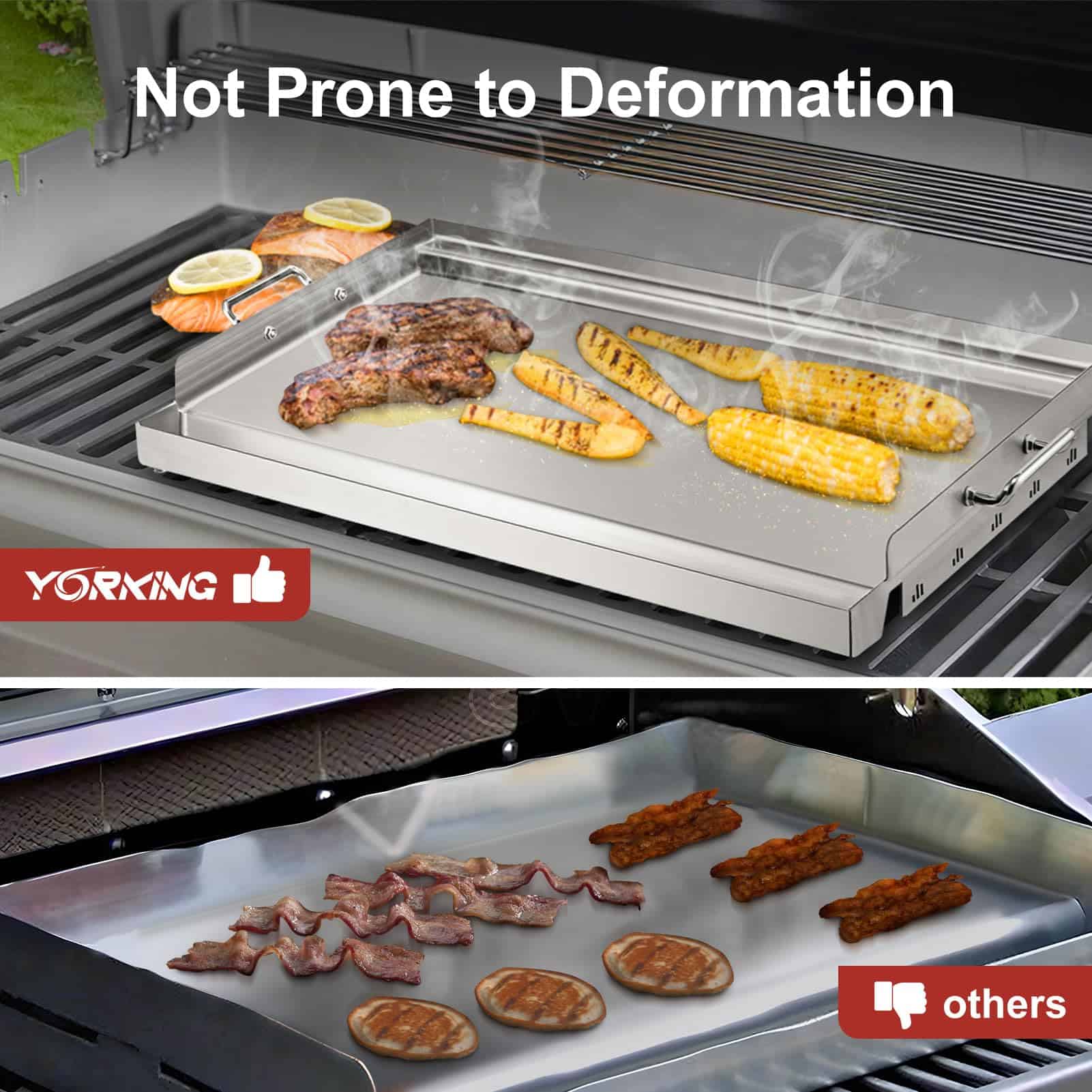3. AMPLIA ÁREA DE COCCIÓN: La placa de la parrilla mide 23″ x 16″ de superficie grande, proporcionando un amplio espacio. La plancha de acero inoxidable YORKING es altamente adecuada para su uso en sartenes eléctricas, estufas de gas y parrillas de carbón, siendo ideal para cocinar panqueques, tocino, huevos, verduras y prácticamente cualquier tipo de alimento.
