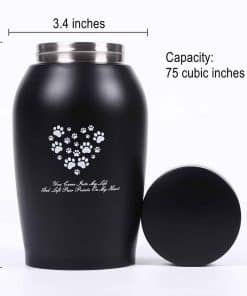Beautiful and Durable This pet urn is made from high-grade sturdy stainless steel. It is very solid, durable, and built to last to ensure that your loved ones are given respect. The screw-top lid provides a secure and reliable seal that keeps your loved one’s ashes stored dry in the dog urn. This urn for dog and cat ashes is a fitting memory of the life and love shared with your pet. It also makes a touching gift for your beloved pet, providing a peaceful and beautiful place to rest. We offer free return service, so you can buy with confidence. If you feel this is not the suitable pet urn for your loved one, you can return it for a full refund. If you have any other requirements, please contact the seller for assistance.