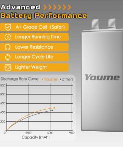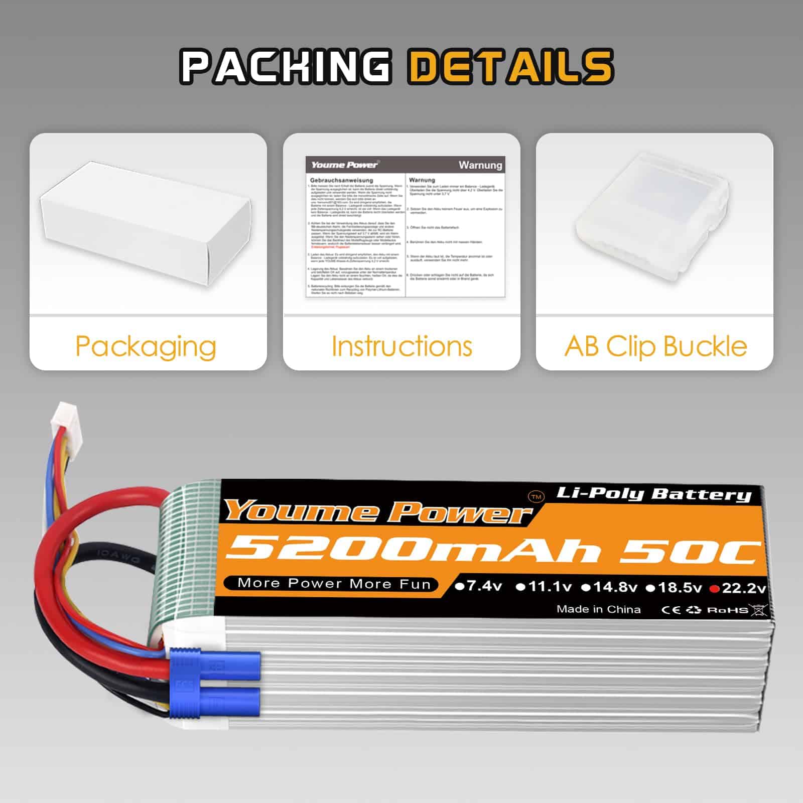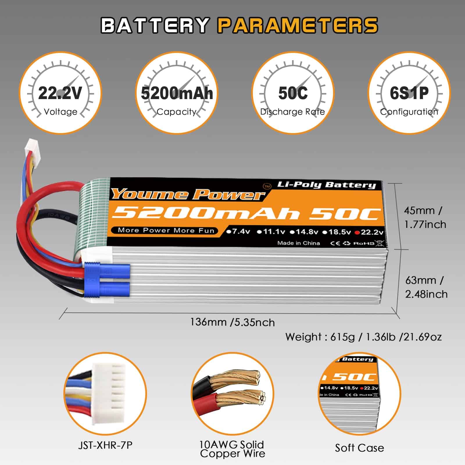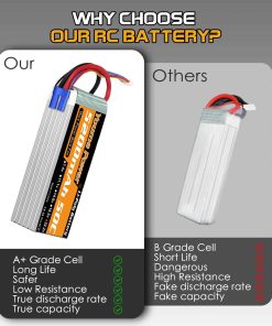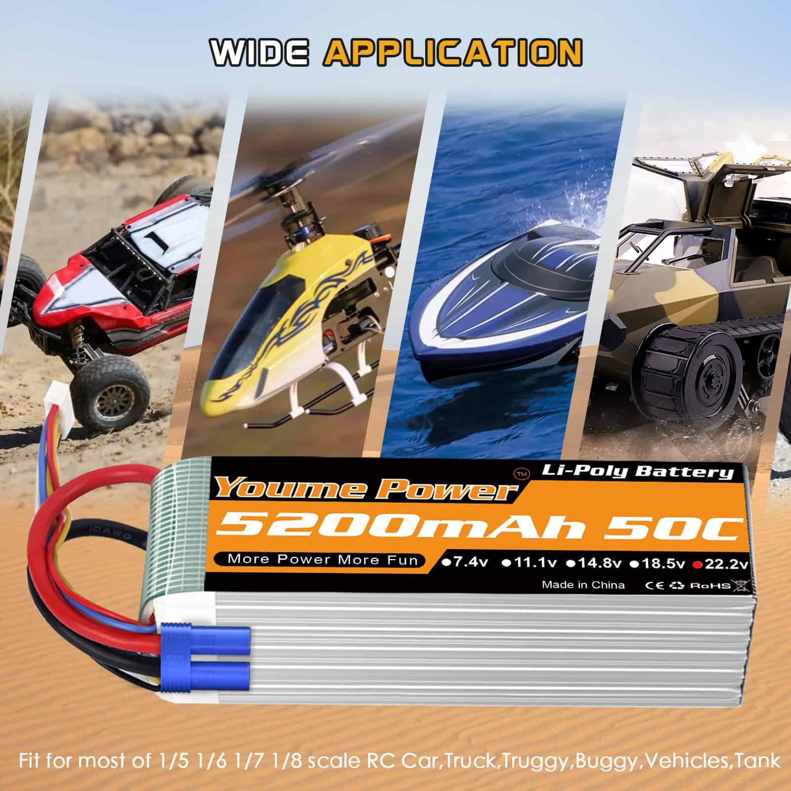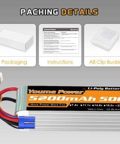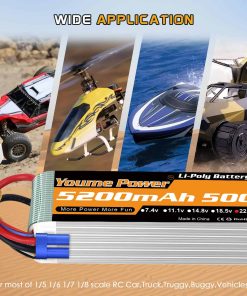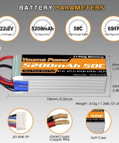 Especificación de la batería lipo 6s – Marca: Youme, Material: Li-polímero, Batería: 6S, Voltaje: 22.2v, Capacidad: 5200mAh, Tasa de Descarga: 50C, Conector de Carga: JST-XH, Conector de Descarga: EC5 y XT90, Tasa de Carga Recomendada: 0.5C-1C, Cable de Silicona: 10AWG, Dimensiones: 136x45x63mm, Peso: 615g, Certificados: CE, ROHS, MSDS, UN38.3. Incluye 2 Paquetes Youme 22.2V 6S 5200mAh Lipo Battery 50C con Conector EC5 y 2pcs x Plugs XT90 Femeninos. Compatible con diferentes modelos de vehículos RC.