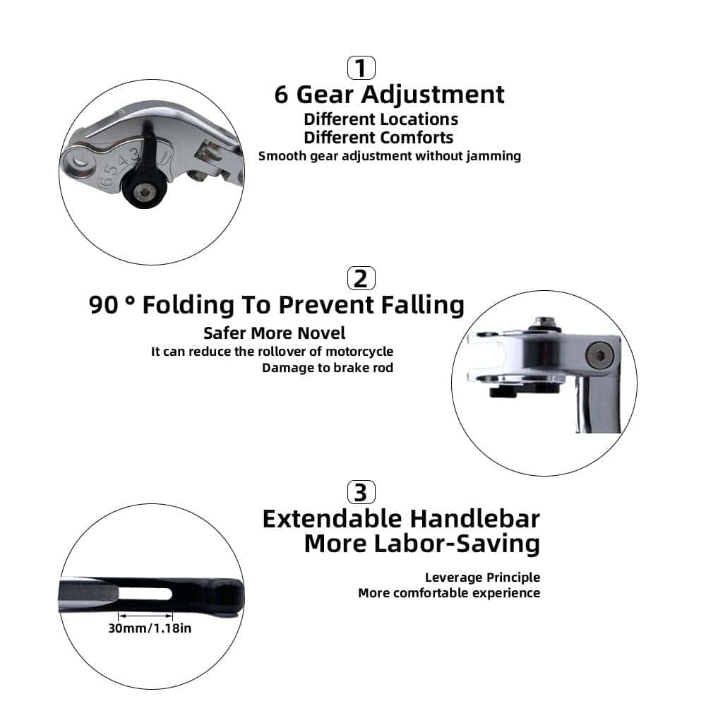 2. AJUSTABLE – Simplemente ajuste el tornillo de ajuste en la palanca, puede ajustar el alcance, desde el más pequeño al más grande, y proporcionar la mejor respuesta de embrague o freno.