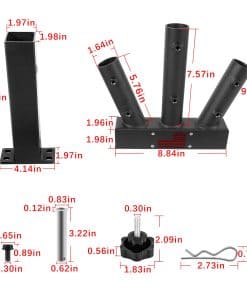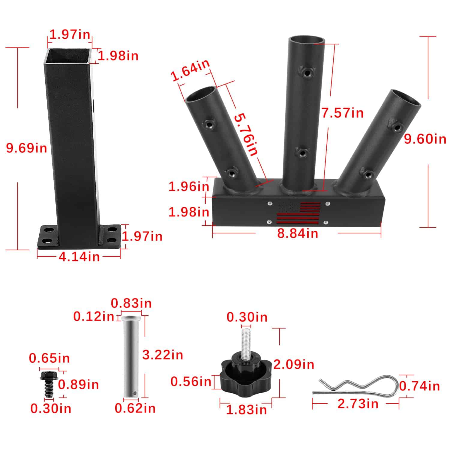 Soporte de poste triple para enganche de bandera está hecho con tubos de acero cuadrados de 2″ x 1/8″ y tubos de acero de 1 1/2″ x 1/8″, pintado con pintura negra y primer (CON TAPA FINAL). El soporte de bandera de enganche viene con tornillos tipo perilla de apriete que pueden fijar firmemente el poste en su lugar para mejorar la estabilidad y seguridad al conducir por la carretera. El soporte de bandera para enganche se usa para tailgating volando tu bandera de equipo favorita, se usa para desfiles o lo que desees mostrar. El soporte de bandera de enganche de remolque está cuidadosamente diseñado y fabricado. Fabricado con acero endurecido de alta calidad con recubrimiento de óxido negro para resistencia, durabilidad y longevidad, es ideal para soportar la mayoría de las condiciones climáticas. Asegura una vida útil inigualable. Fácil de instalar, simplemente deslice el soporte de poste de bandera de enganche en el receptor de enganche y bloquee en su lugar usando el pasador de enganche.