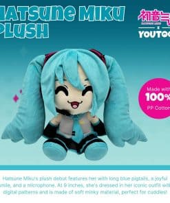 ¡Hatsune Miku regresa a Youtooz para tomar el centro del escenario en su magnífico debut de peluche! Sentada a 9 pulgadas de altura con sus largas coletas azules de cabello sostenidas en su lugar con dos accesorios para el cabello negros y rosas y cayendo para descansar a sus lados, una sonrisa alegre cruza su rostro mientras se prepara para cantar con todo su corazón en el micrófono que sobresale de un lado de su cara sujeto a unos audífonos brillantes. Vestida con su icónico atuendo azul, negro y gris, una corbata brillante cuelga en su parte delantera mientras sus mangas oscuras se iluminan con patrones amarillos digitales y sus piernas se mueven hacia adelante desde debajo de una falda plisada. Este peluche está lleno hasta los topes con un 100% de algodón de polipropileno y está hecho de un material suave de minky, ¡absolutamente perfecto para abrazar o armonizar con!