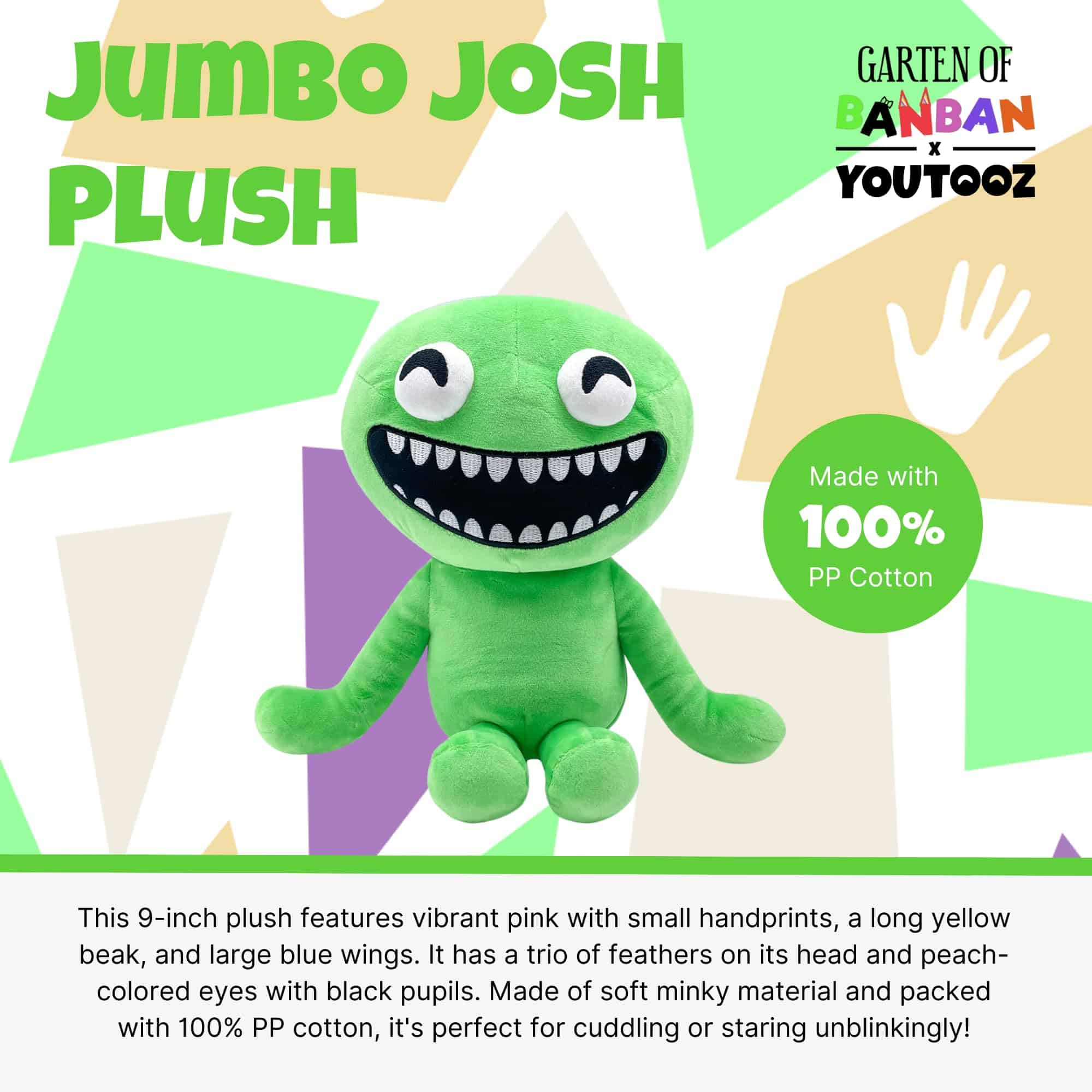 Jumbo Josh sentado a 9 pulgadas de altura, una gran sonrisa dentada se extiende por toda su cabeza ovalada mientras dos pequeños ojos sobresalen por encima. Con dos largos brazos que se extienden a cada lado de su robusto cuerpo verde lima, el peluche Jumbo Josh planta sus grandes manos carnosas en el suelo mientras extiende sus cortas piernas hacia adelante. ¡Este peluche Jumbo Josh Garten of Banban está absolutamente lleno hasta los topes de algodón PP y está hecho de material minky! ¡Bueno para abrazar, o abrirse paso a través de cualquier cosa en su camino! Garten of Banban es un juego de terror en primera persona desarrollado y publicado por Euphoric Brothers en el que exploras el ‘Kindergarten de Banban’ cerrado solo para descubrir que él y sus habitantes de mascotas no son exactamente lo que parecen.