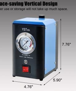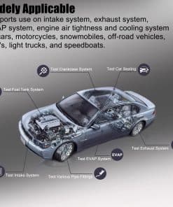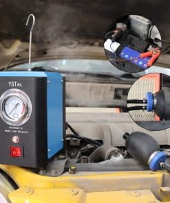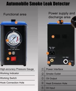 La máquina de prueba de fuga universal YSTOOL es en general un cubo sólido con estructura compacta y un pequeño tamaño, equipado con una bomba de aire en su interior y usa una batería de 12V como fuente de alimentación, evitando restricciones en el sitio cuando está en uso. El medidor de presión de alta precisión de 2-1/2″ integrado es conveniente para verificar la presión del sistema en tiempo real (presión no ajustable). Con mecanismo de protección por sobrecarga, esta pequeña máquina detectora de fugas se apagará automáticamente cuando funcione continuamente durante más de 20 minutos. Viene con un total de 13 herramientas coincidentes con el juego de máquina de humo del sistema EVAP, que incluye la máquina de detección de fugas del sistema de sellado, tubo de salida de humo, cable de alimentación desmontable específico, adaptador universal, aceite de prueba, llave de núcleo de válvula, tapones cónicos (3 piezas), conector adaptador de cárter, cono con tapa, adaptador sustituto y gancho. Fácil de entender y usar con instrucciones y diagramas fáciles de leer. El empaque a prueba de golpes protege la máquina detectora de fugas de humo durante el transporte. El kit de la máquina de detección de fugas de humo incluye una pequeña botella de aceite de prueba, y puede ser reemplazada por aceite mineral o aceite para bebés para su uso posterior. Su satisfacción y reconocimiento son siempre lo que perseguimos. El producto se puede devolver incondicionalmente en un mes y también ofrecemos 1 año de garantía, así que sientase seguro de comprar. No dude en contactarnos si no está satisfecho con cualquier cosa durante el uso, ¡y le responderemos en un plazo de 24 horas!