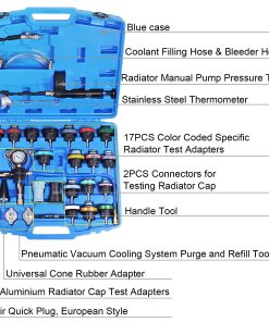 Equipo de prueba de presión de refrigerante que incluye 3 herramientas, detector de fugas de radiador, herramienta de relleno de refrigerante y termómetro. 17 adaptadores específicos y 1 adaptador de goma cónico universal, para conectar casi todos los tipos de aberturas de radiador en vehículos nacionales e importados, ayudan a verificar la fuga del tanque de agua y llenar el refrigerante bajo ambiente de vacío.