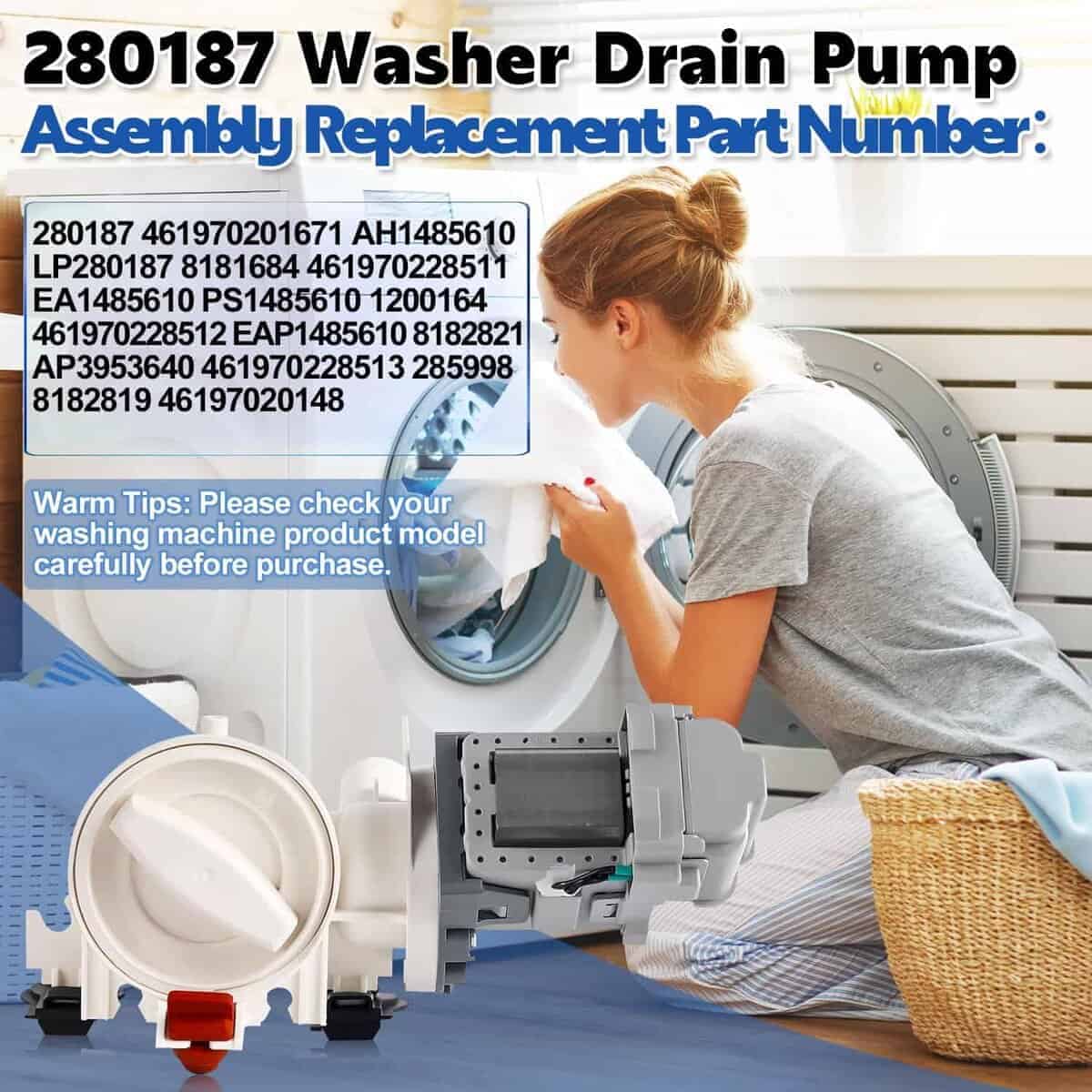1. Números de parte reemplazables 280187 Ensamblaje de la Bomba de Drenaje de la Lavadora Número de Parte de Reemplazo PS1485610, AP3953640, AH1485610, EAP1485610, 8181684, 8182819, 8182821, 46197020148, 461970201671, 461970228511, 61970228512, 461970228513, 1200164, LP280187, 285998, PD00002352, etc. Cuando compre un kit de bomba de drenaje, asegúrese de que sea compatible con la marca y modelo de su lavadora.