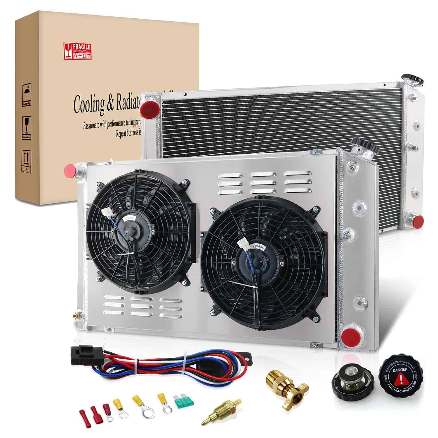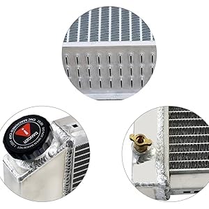 2. KIT DE RADIADOR DE ALUMINIO + VENTILADOR SHROUD + TERMOSTATO – El radiador YUFUQIDA está hecho de construcción de aluminio AA5052, incluye 2 ventiladores de refrigeración de motor de 12 pulgadas y shroud, todos los elementos son inspeccionados y probados al 100% para garantizar la calidad.