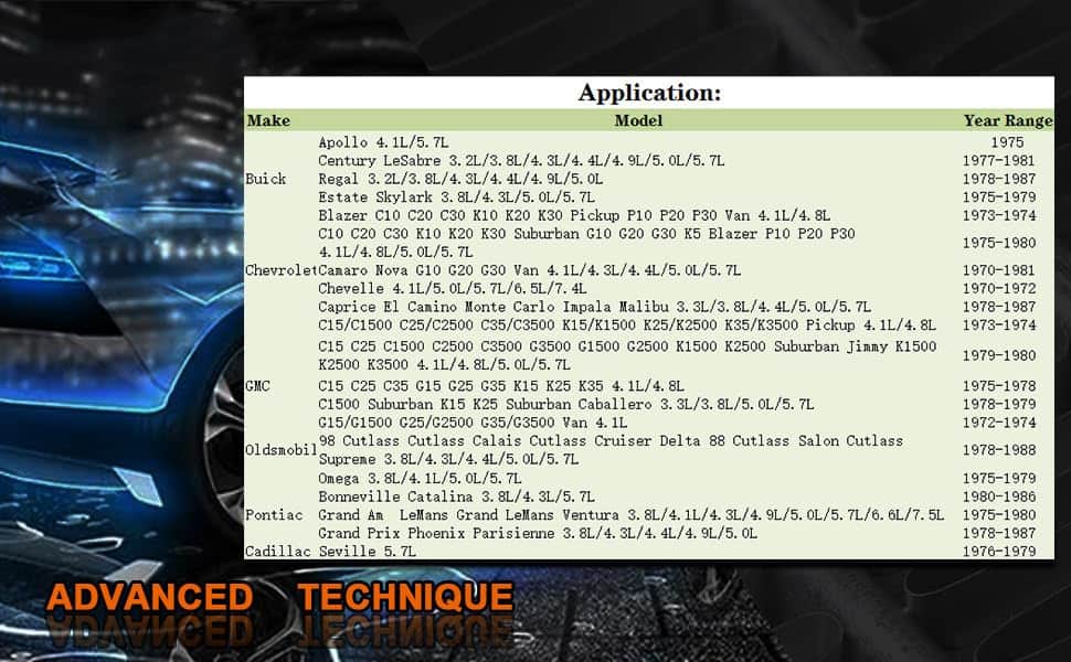 1. COMPATIBILIDAD CON VEHÍCULOS – Compatible con Chevy Nova 1975-1979; Chevy Camaro 1970-1980; Chevy/GMC G-Series 1970-1985; Chevy Monte Carlo 1983-1987; Oldsmobile Cutlass 1978-1988; Chevy Blazer 1973-1985; Chevy Suburban 1976-1980; Chevy El Camino 1978-1987; Chevy Impala 1980-1985; Chevy/GMC C/K/G-Series C10-C20 C25-C3500 1970-1985.