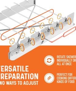 4. Resistente Acero Inoxidable – Tu duradero espeto de barbacoa giratorio está hecho de acero inoxidable y está diseñado para durar. Este soporte resistente fue diseñado para un uso frecuente durante muchos años y asados por venir. Si bien este set de espetos es resistente, la cocina uniforme que garantiza significa que tu comida no lo será.