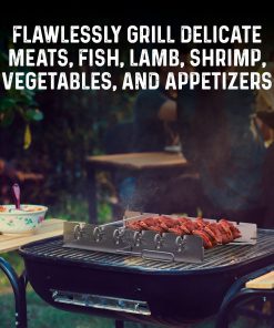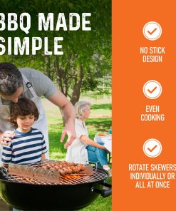 2. Diseño Antiadherente, Cocina Uniforme – Tu soporte de espetos eleva los pinchos de kebab lejos de las parrillas y las muescas mantienen los espetos en su lugar. ¡No más comida pegada a la parrilla! Gira cada espeto individualmente o usa el mango para girar todos a la vez. Cocina fácil y uniformemente tu deliciosa comida. Cocina a la perfección carnes delicadas, pescado, cordero, camarones, verduras y aperitivos. El bocado perfecto, cada vez.