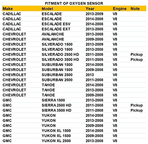2 Pares de Sensores de Oxígeno Frontales y Traseros Compatible con Chevy SILVERADO 1500 SILVERADO 3500 HD Pickup 6.2L 6L 5.3L 4.8L 4pcs sensor de o2 234-4668 234-4256 Compatible con CADILLAC ESCALADE 2013-2009 6L ESCALADE 2014-2008 6.2L ESCALADE ESV 2014-2008 6.2L ESCALADE EXT 2013-2008 6.2L Compatible con CHEVROLET AVALANCHE 2013-2008 5.3L AVALANCHE 2009-2008 6L SILVERADO 1500 2013-2009 6.2L SILVERADO 1500 2013-2008 6L SILVERADO 1500 2013-2008 5.3L SILVERADO 1500 2013-2008 4.8L SILVERADO 2500 HD 2011-2008 6L Pickup SILVERADO 3500 HD 2011-2008 6L Pickup SUBURBAN 1500 2014-2008 5.3L SUBURBAN 1500 2009-2008 6L SUBURBAN 2500 2013 6L SUBURBAN 2500 2011-2008 6L TAHOE 2014-2008 5.3L TAHOE 2013-2008 6L TAHOE 2009-2008 6.2L TAHOE 2009-2008 4.8L Compatible con GMC SIERRA 1500 2013-2008 6L SIERRA 1500 2013-2008 6.2L SIERRA 1500 2013-2008 5.3L SIERRA 1500 2013-2008 4.8L SIERRA 2500 HD 2011-2008 6L Pickup SIERRA 3500 HD 2011-2008 6L Pickup YUKON 2014-2008 6.2L YUKON 2014-2008 5.3L YUKON 2013-2008 6L YUKON 2009-2008 4.8L YUKON XL 1500 2014-2008 6.2L YUKON XL 1500 2014-2008 5.3L YUKON XL 1500 2009-2008 6L YUKON XL 2500 2013-2008 6L