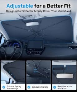 2. Ajuste Perfecto con Cuatro Opciones de Tamaño: Elige entre cuatro tamaños actualizados, diseñados con un borde de muelle flexible que permite un ajuste de 4-8 pulgadas, proporcionando un ajuste ceñido y de cobertura completa. La sombra del sol se adapta perfectamente a varios parabrisas y formas de salpicaderos, asegurando que cada esquina esté perfectamente protegida.