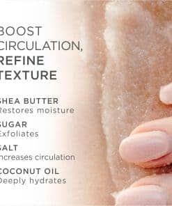 1. PIEL SUAVE Y LISA. Revela una piel más suave y lisa eliminando suavemente las áreas secas con finos granos de azúcar y sal. Este exfoliante corporal exfoliante ayuda a aumentar la circulación y mejorar la textura y apariencia general de la piel para un brillo radiante.