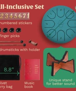 Instrumento musical en forma de tambor de lengua de acero de 6 pulgadas con 8 notas, perfecto para prácticas de sanación acústica, conciencia plena y terapia musical. El tambor viene con un soporte único dedicado que permite un sonido más profundo o alto según se desee. Incluye 2 baquetas con un soporte, 4 púas de dedo para tocar con los dedos, baquetas o púas, un Libro de Música y una bolsa de terciopelo para transportar el tambor fácilmente. Ideal para principiantes y adultos que buscan un instrumento musical espiritual y creativo para explorar su creatividad y disfrutar de la música ilimitada que el tambor de acero puede ofrecer. Este tambor de lengua de acero es un regalo hermoso y significativo para cualquier persona que esté en busca de paz y serenidad a través de la música.