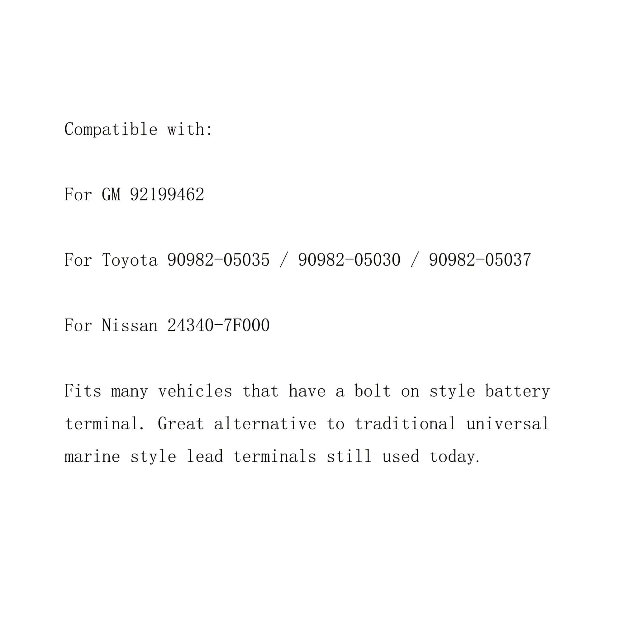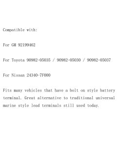 Descripción del Producto: Color: Plateado Tipo de Pieza: Reemplazo Directo Número de Pieza del Fabricante: Para GM 92199462, Para Toyota 90982-05035 / 90982-05030 / 90982-05037, Para Nissan 24340-7F000 Compatibilidad: Para GM 92199462 Para Toyota 90982-05035 / 90982-05030 / 90982-05037 Para Nissan 24340-7F000 Se adapta a muchos vehículos que tienen un terminal de batería estilo perno. Excelente alternativa a los terminales de plomo universales estilo marino tradicionales todavía en uso hoy. El paquete incluye: 10 Pcs de Abrazaderas de Terminal de Batería Positivo. Consejos: Por favor, verifique el número de pieza antes de comprar. Si no está seguro de si es adecuado o no, por favor contáctenos y adjunte la información de su vehículo con el VIN, o una foto.