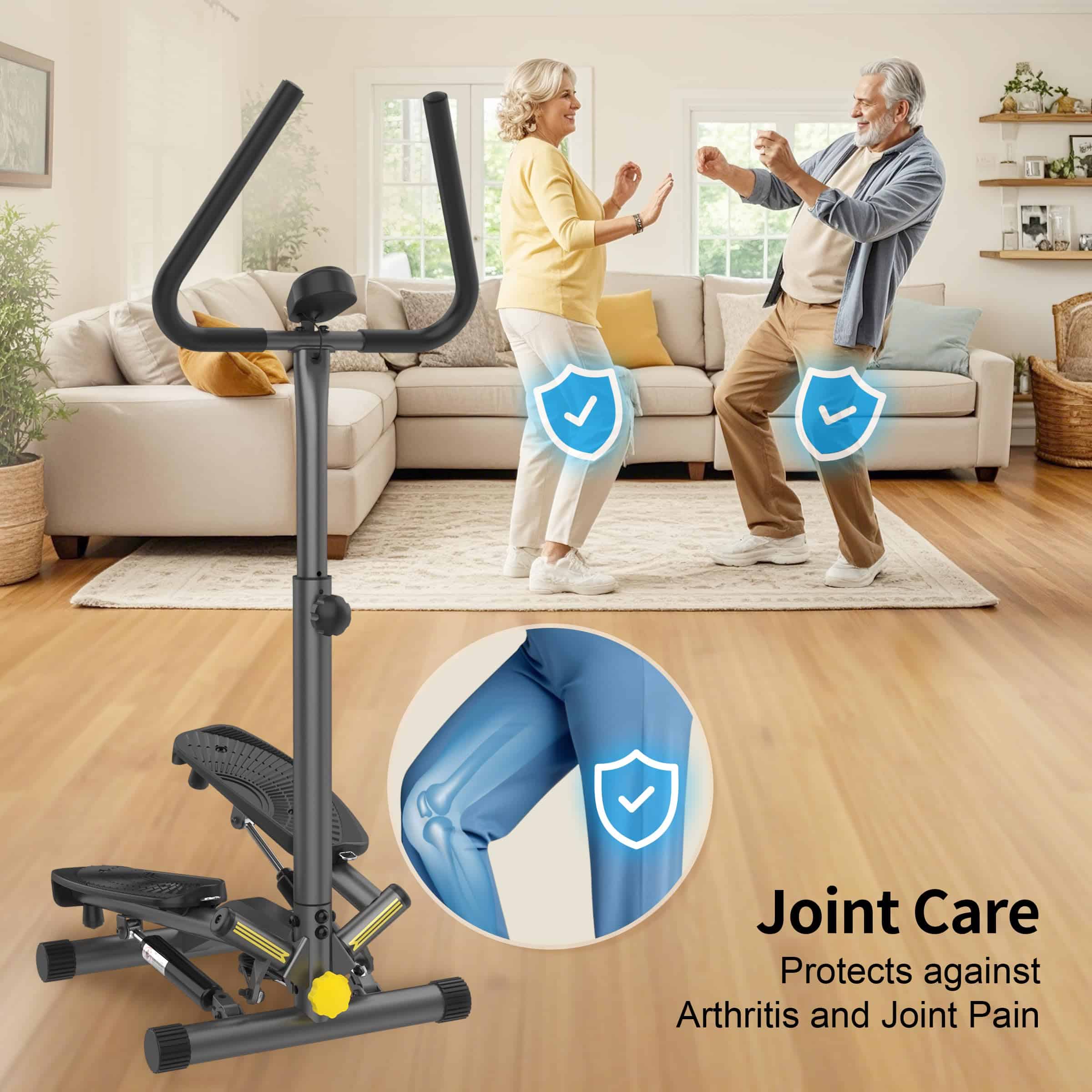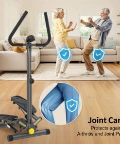 La barra de manija segura y resistente proporciona estabilidad y seguridad mientras realizas tus ejercicios, permitiéndote centrarte en tus objetivos de fitness sin preocupaciones. El diseño silencioso del stepper garantiza una experiencia de entrenamiento pacífica, sin interrumpir a los demás a tu alrededor.