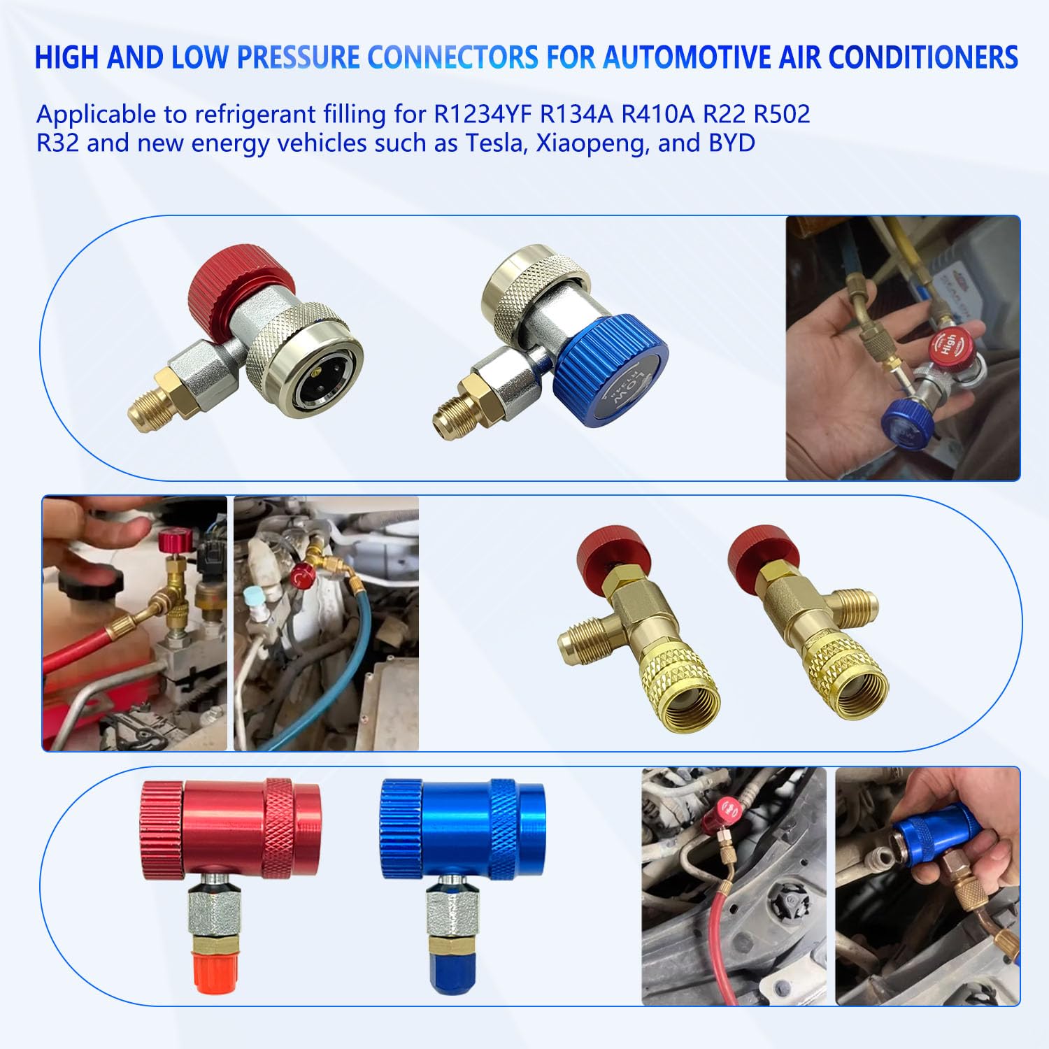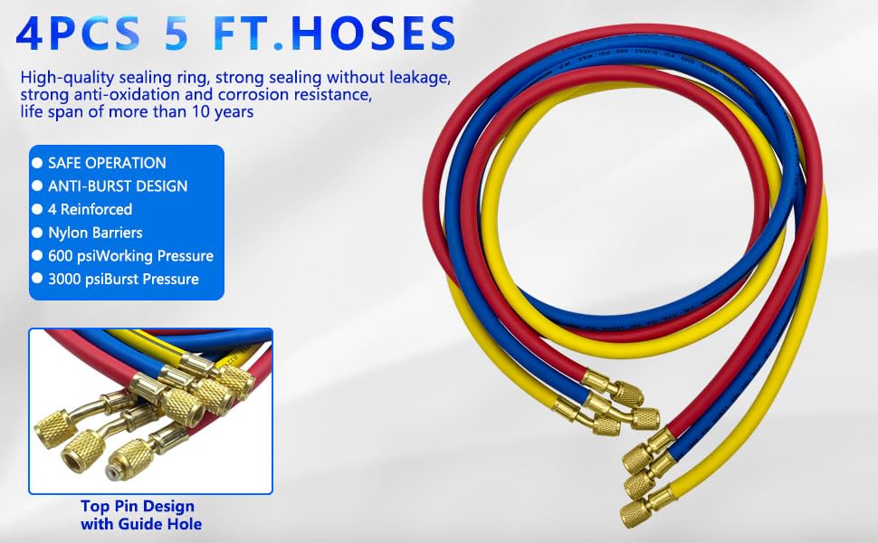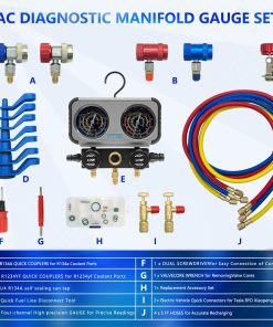 El conjunto de diagnóstico de manómetros para aire acondicionado automotriz de ZKTOOL tiene una amplia selección de vehículos y refrigerantes, incluyendo un adaptador adicional de 2PC para refrigerantes R410A R22 además de los adaptadores originales para R1234YF y R134A, lo que nos permite elegir entre más modelos de vehículos y refrigerantes para la carga y evacuación de freón de coche, perfecto para la carga de freón de aire acondicionado, evacuación, chequeo diagnóstico y trabajo de recuperación. Los diales extra grandes y de colores con unidades de grados Fahrenheit son fáciles de leer, los manómetros tienen una presión máxima de 800 psi (rojo) y 550 psi (azul). El diseño de la ventana de visualización te ayudará a ver el refrigerante líquido fluyendo cuando estés cargando el refrigerante. Incluye 4 mangueras extra largas de 5 pies y de alto impacto, cuerpo de manguera engrosado con depresor de núcleo de válvula preciso y curva de 45 grados en un extremo para un acceso conveniente. Manguera con una presión máxima de trabajo de 600 psi y una presión de explosión de 3000 psi. Movimiento preciso con carcasa de manómetro mejorada, resistente al uso pesado y caídas accidentales, todas las partes metálicas están hechas de materiales duraderos como latón y aluminio. Ideal para tu garaje en casa o taller mecánico. Viene con todo lo que necesitas para un trabajo eficiente de carga de aire acondicionado.