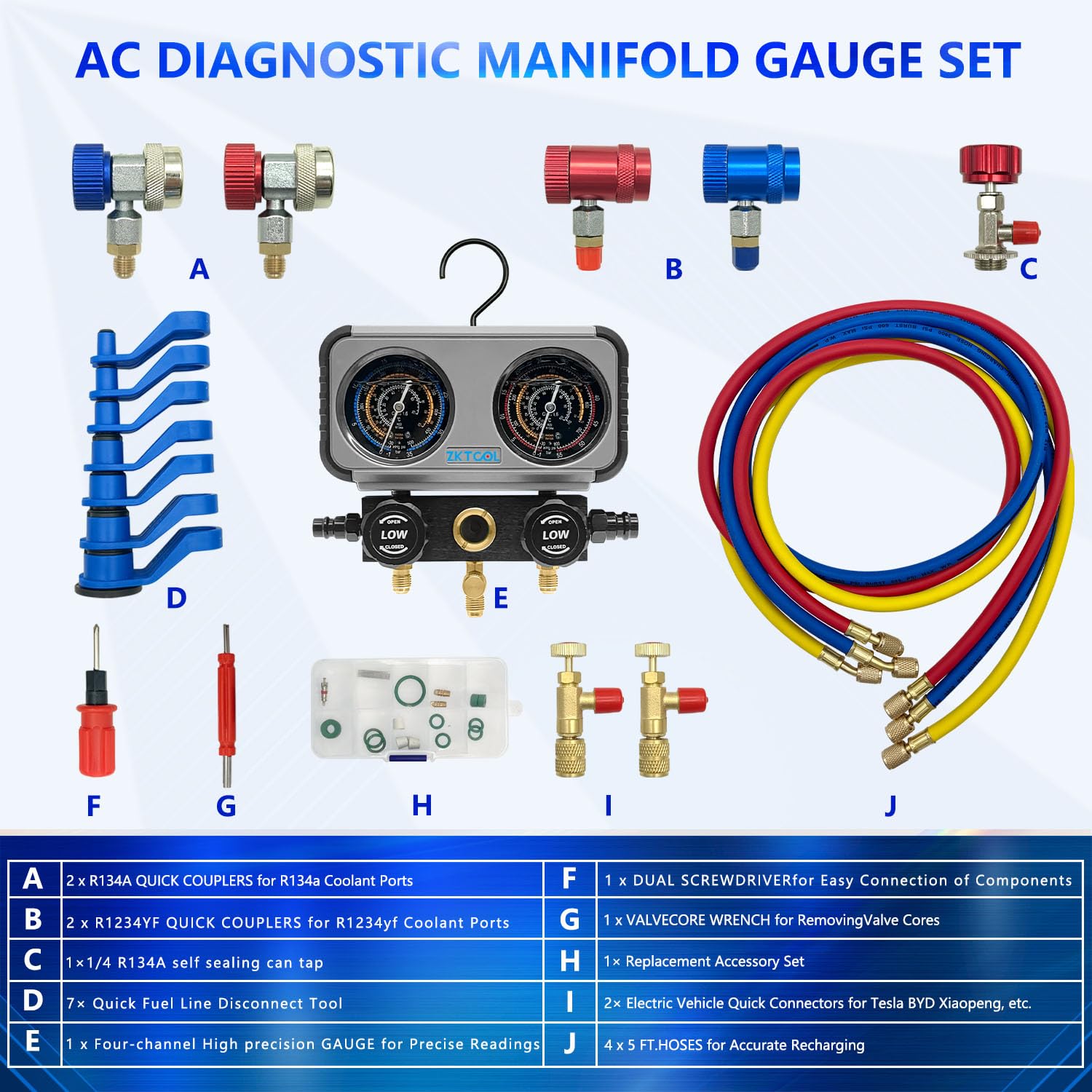 ZKTOOL AC R1234YF R134A Gauge Set, Manifold de 4 Válvulas