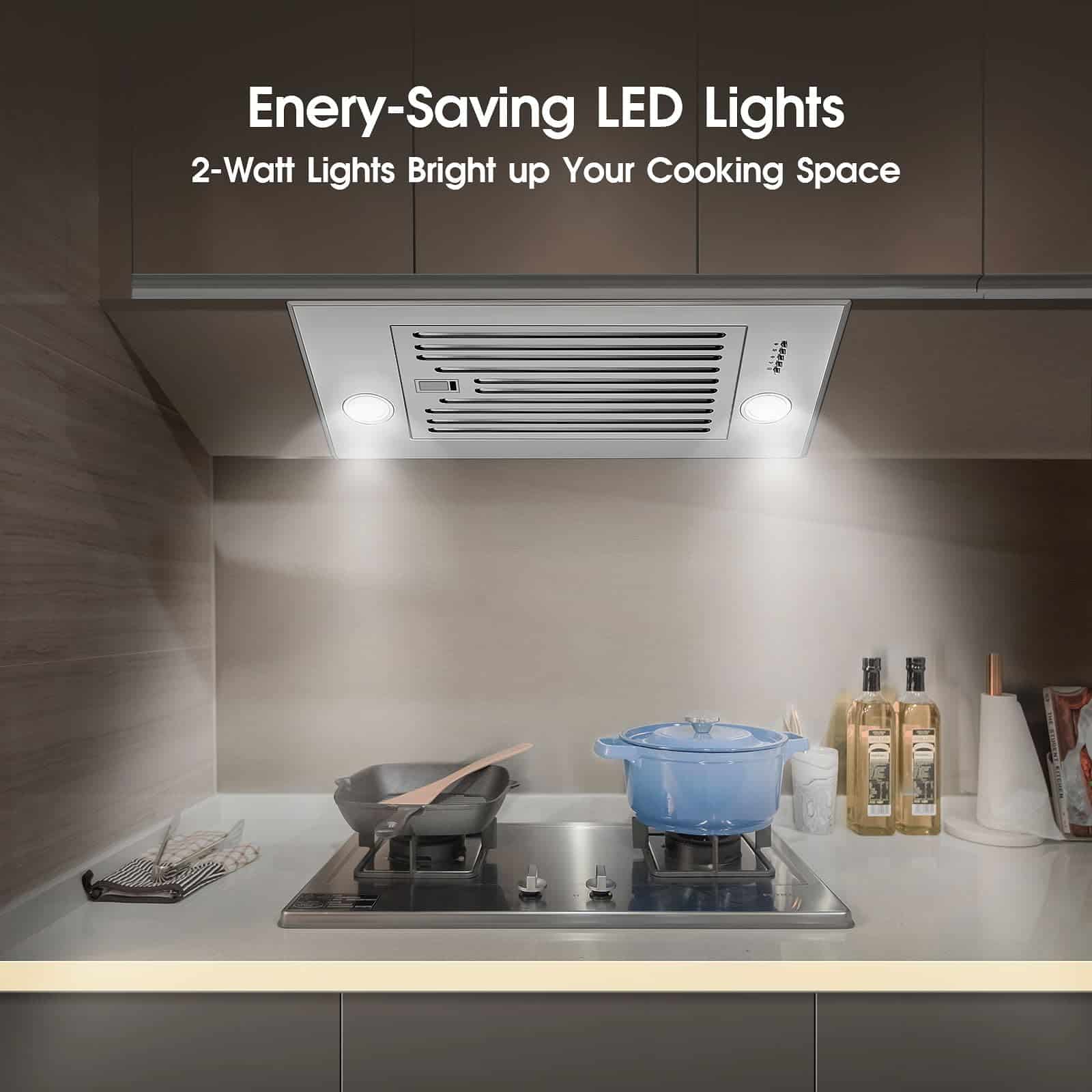4. Lámparas Brillantes Ahorro de Energía. La campana extractora tiene 2 luces LED de 2W, que no solo proporcionan la cantidad de luz necesaria para cocinar, sino que también ahorran energía en su cocina al emitir suficiente luz.