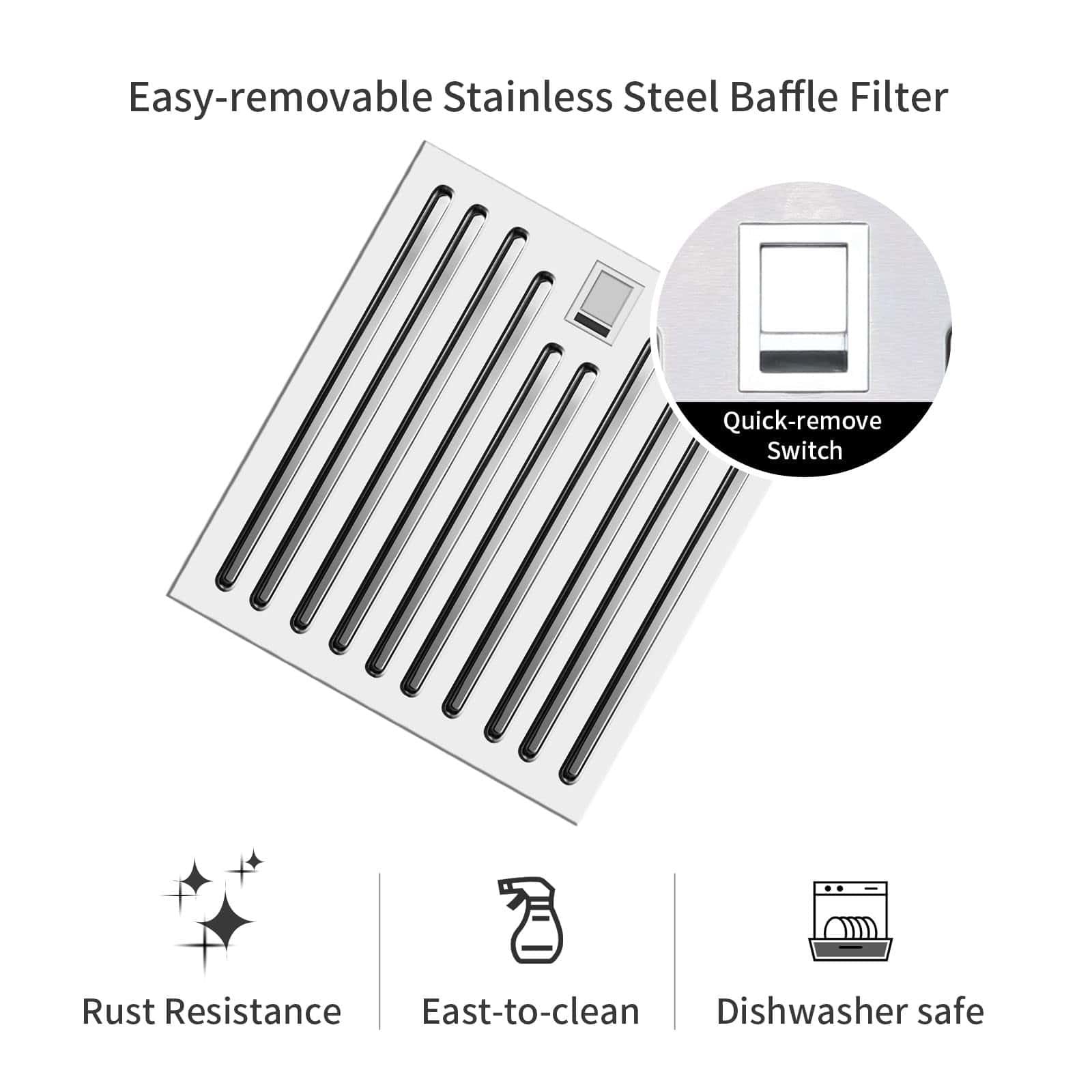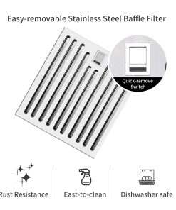 2. Filtración superior. La campana extractora de 24 pulgadas viene con un filtro de grasa de acero inoxidable duradero y fácil de limpiar que se puede lavar en el lavavajillas y es fácil de quitar. Este filtro específico para campanas de cocina atrapa la grasa y el aceite de cocción con facilidad, reduciendo la propagación de olores en su cocina.