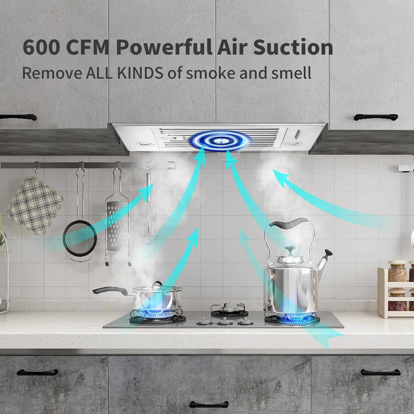 1. Extractora de 24 pulgadas con alto rendimiento que cuenta con un potente sistema de soplado y 3 diferentes velocidades de ventilador, lo que le permite alcanzar una potencia de succión de 600CFM, eliminando eficazmente grandes cantidades de humo y olores de la cocina.