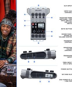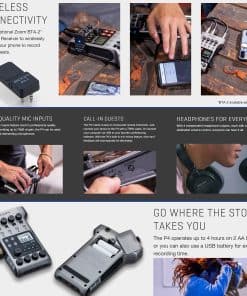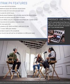 El Zoom PodTrak P4 es un grabador de podcast multitrack portátil de bajo costo que te permite grabar rápidamente hasta cuatro micrófonos, manejar 2 llamadas remotas libres de eco simultáneamente, activar muestras de sonido y ofrecer alimentaciones de audífonos independientes para todos tus invitados, todo al mismo tiempo y con una simplicidad refrescante. Desde los controles intuitivos y táctiles hasta la abundante vida útil de la batería y las potentes funciones de procesamiento de audio, el PodTrak P4 está bien equipado para ayudarte a grabar o transmitir audio prístino para podcasts de panel. Micrófonos dinámicos y de condensador, pads de sonido personalizables, llamadas mediante tu smartphone u ordenador, y salidas de audífonos independientes; el PodTrak P4 puede manejar todo lo que necesitas que haga una estación de producción de podcast. En la caja: 2 x Pilas AA Garantía limitada de 1 año Kit incluye: Grabador de podcast multitrack portátil Zoom PodTrak P4 Micrófono dinámico Zoom M-1 Paraviento Audífonos Zoom Soporte de trípode de mesa para micrófono Cable y adaptador Paño de limpieza